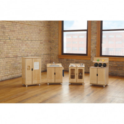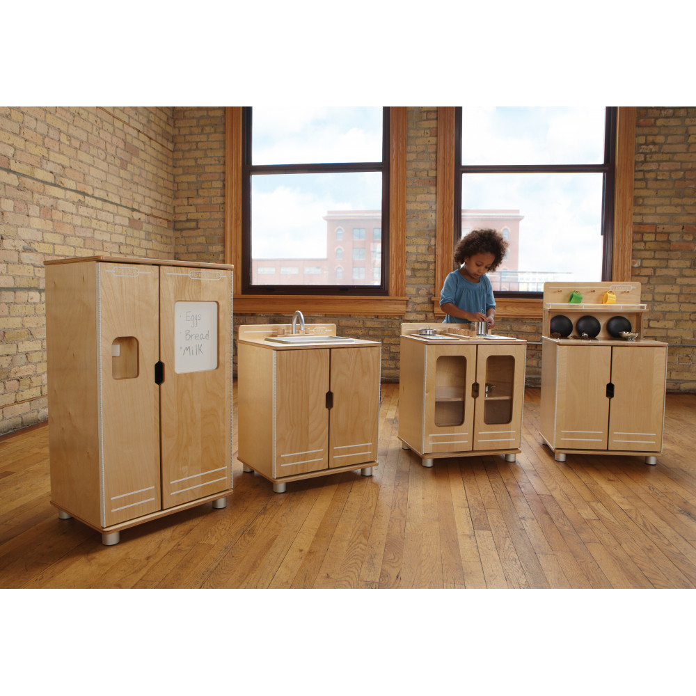 Four piece set includes Stove, Sink, Fridge & Cupboard - the ultimate in creative play! Loads of interactive elements keep kids entertained. Ample storage and aesthetic design that adults will appreciate. Created by renowned modernist designer—Edgar Blazona—for a sleek, cohesive, and modern design.