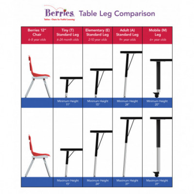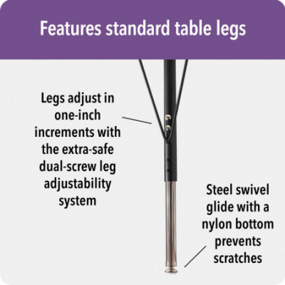 KYDZSafe® edges. KYDZStrong® construction. TRUEdge®. Choose from multiple tabletop and TRUEdge color combinations. Thermally Fused Laminate tabletops 1-1/8” thick. Quick mount legs with minimal assembly. Legs adjust in one-inch increments with the extra-safe dual-screw leg adjustability system. Helpful Hint: Most children require elementary size tables – tiny tables typically fit children just 1 to 2 years old. Adjusts from 15" to 24" high. See cleaning recommendations at www.jonti-craft.com/cleaning.