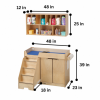 Pull-out stairs for toddlers conveniently glides under table when not in use. Extra deep rails exceed recommended safety standards. Three generous supply shelves, one fixed and two adjustable. Paper roll dispenser included accommodates a fifteen-inch paper roll and attaches to either end of the table. Changing pad and safety strap included. Tubs sold separately. Unit is 52.5" wide with paper-roll holder attached.