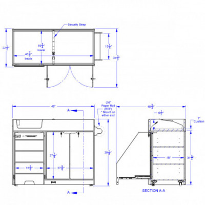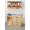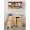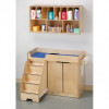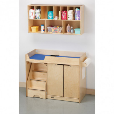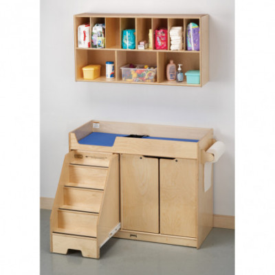 Pull-out stairs for toddlers conveniently glides under table when not in use. Steps can be locked in the "in" or "out" position. Extra deep rails exceed recommended safety standards. Three generous supply shelves, one fixed and two adjustable. Paper roll dispenser included accommodates a fifteen-inch paper roll and attaches to either end of the table. Changing pad and safety strap included. Tubs sold separately. Unit is 52.5" wide with paper-roll holder attached.